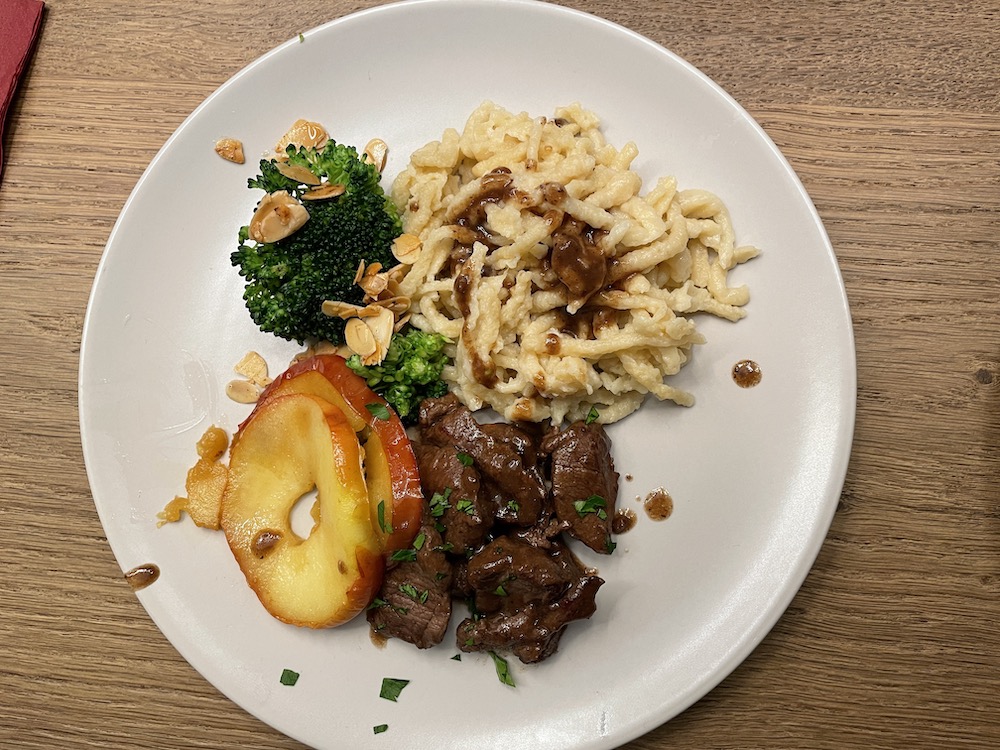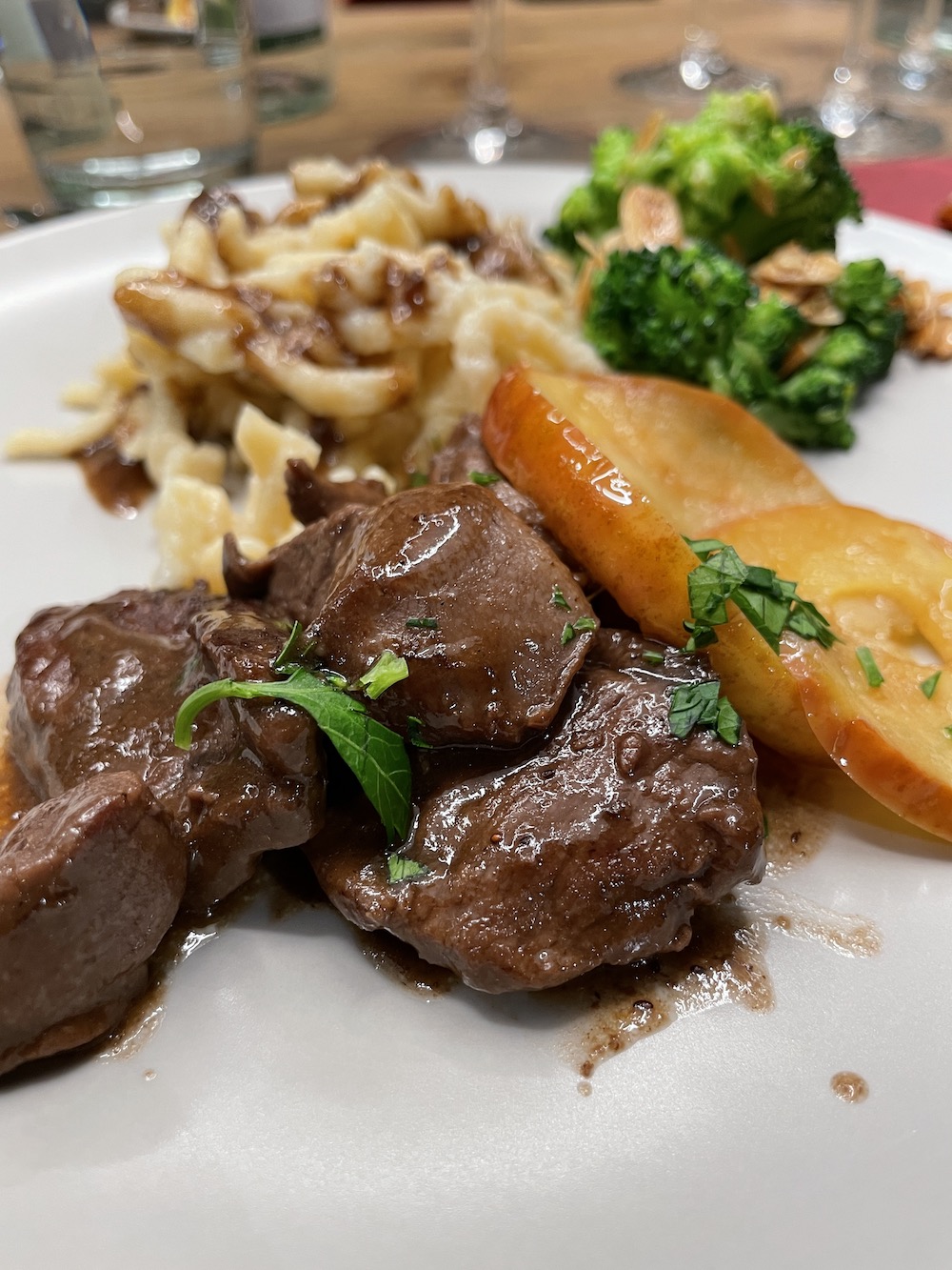 | Hauptgang: Christophe | Geschnetzeltes vom Reh an Calvados, Spätzle, Mandelbrokoli 2019 Spätburgunder Pfarrberg Waldulm |