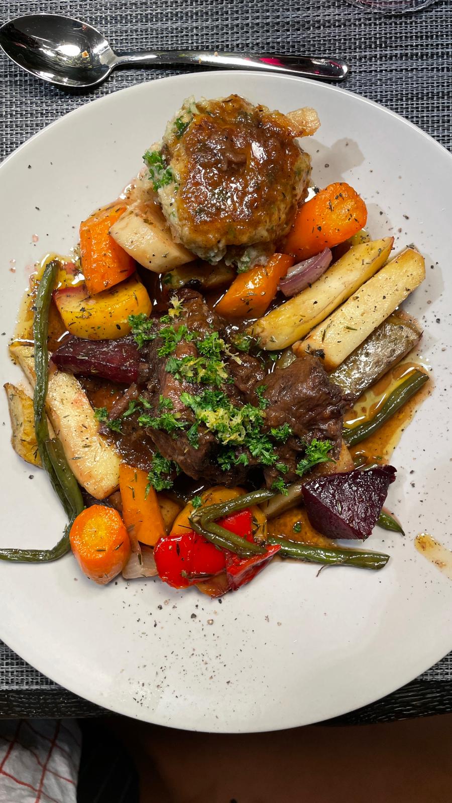 | Hauptgang: Gerd | Ochsenschwanzragout, Semmelknödel und glasiertes Gemüse 2019 Réserve La Grange |