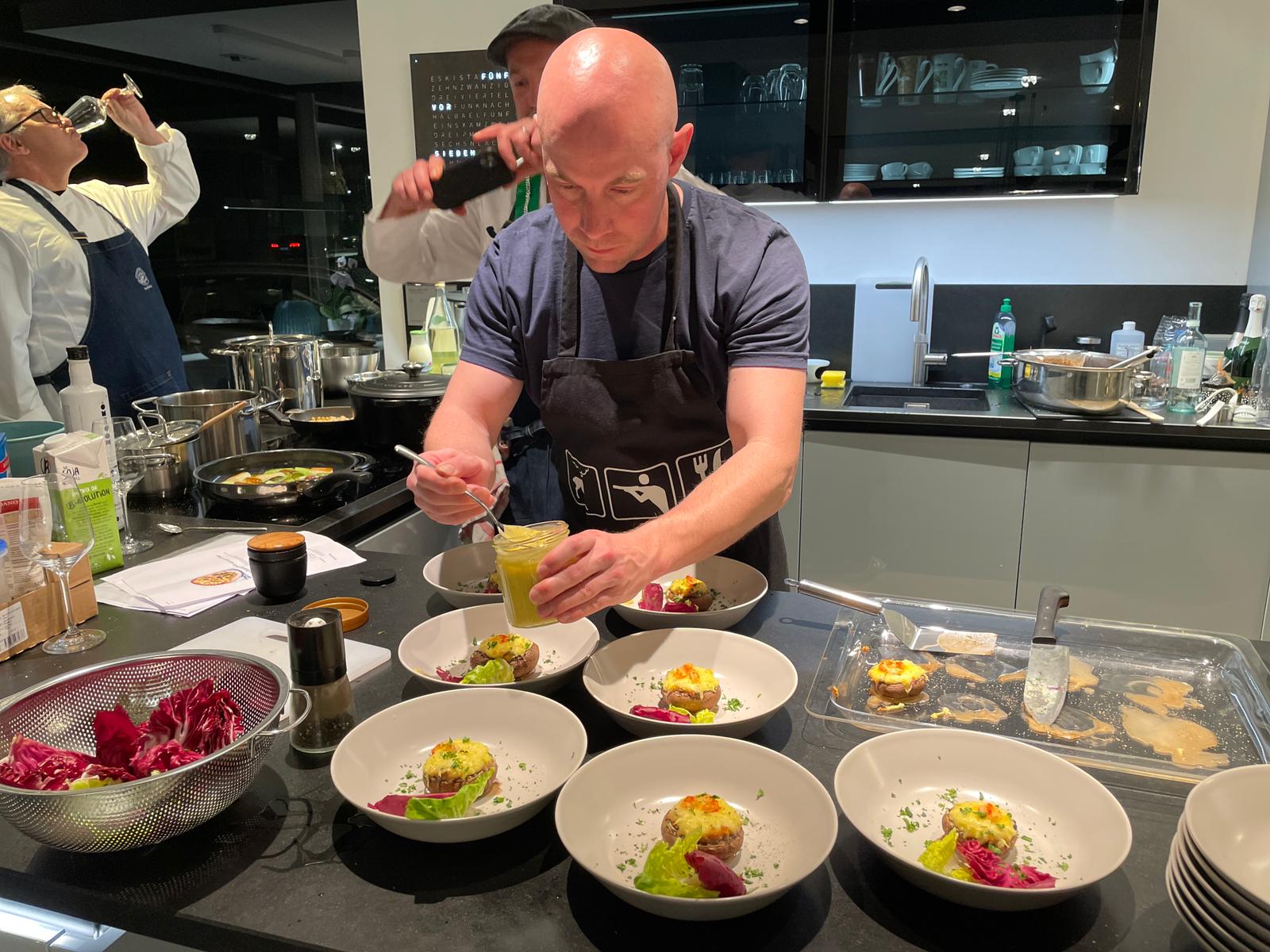 | Amuse: Christophe | Amuse gratinierte Flusskrebsschwänze im Pilzkopf 2019 Sylvaner Henri Ehrhart, Alsace |