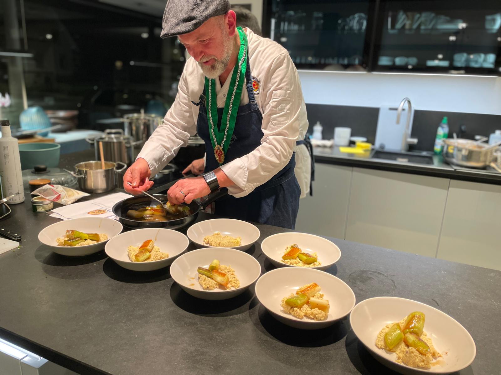 | 1. Vorspeise: Gerd | Karamellisierter Lauch mit Cacio-e-Pepe Hirse 2020 Auxerrois Kilian Hunn |