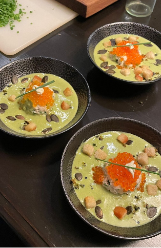 | 1.Vorspeise: Harald | Süppchen von grünen Erbsen / Forellentatar / Kaviar 2019 Sauvignon Blanc New Zealand Marlborough |