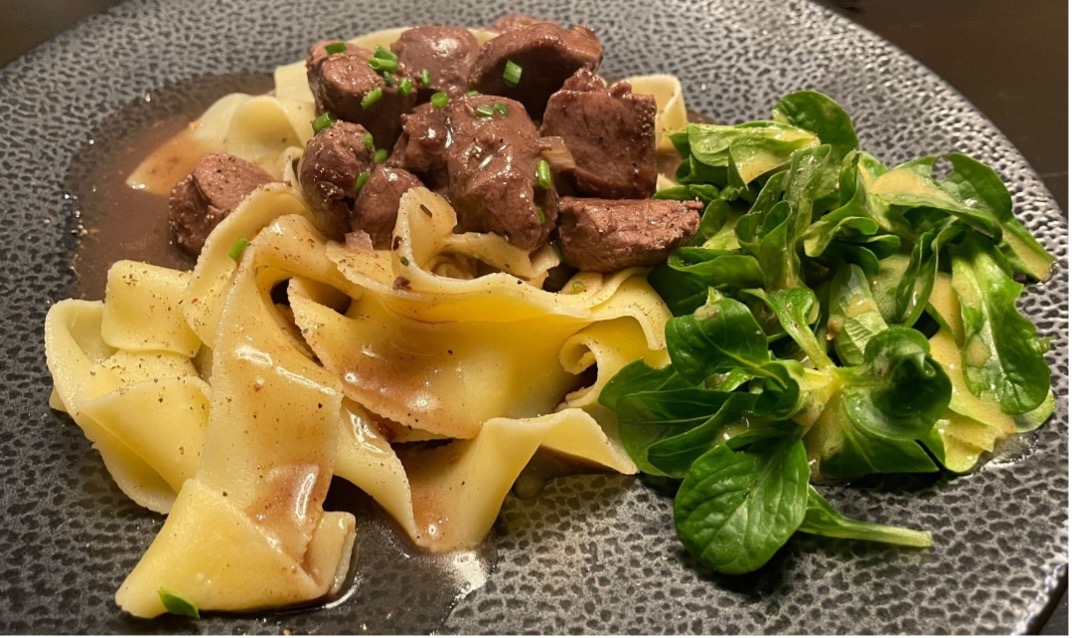 | Hauptgang: Christophe, Josef | Rehragout / Pappardelle / Feldsalat 2020 Côtes du Rhône |